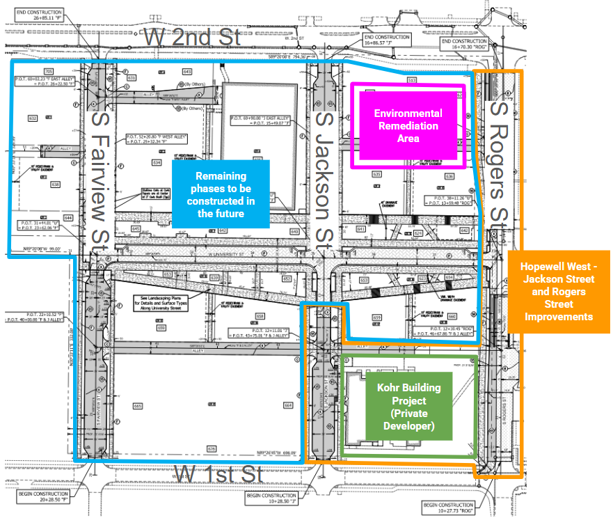 The City of Bloomington continues to invest in the site of the former IU Health Bloomington Hospital—now being transformed into the Hopewell Neighborhood, Bloomington’s next downtown community—through a series of upcoming construction upgrades.