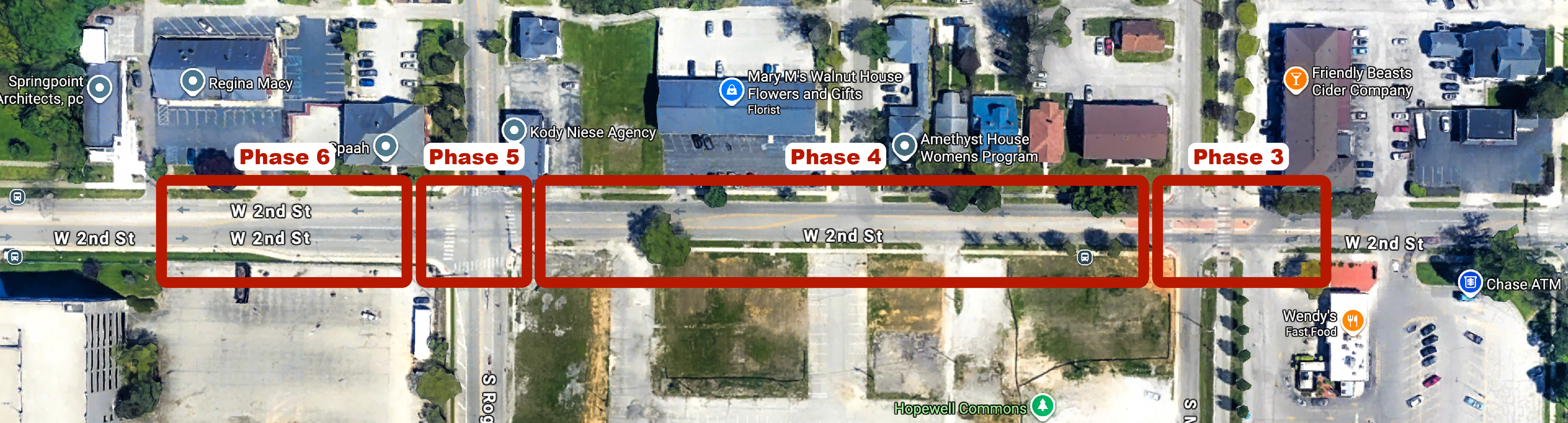 The section of West Second Street just west of Rogers Street is planned to reopen on Thursday, Oct. 9, following completion of Phase 5. If sewer work progresses as planned, portions of Phase 6 may also be completed at that time, with only final road repairs remaining.